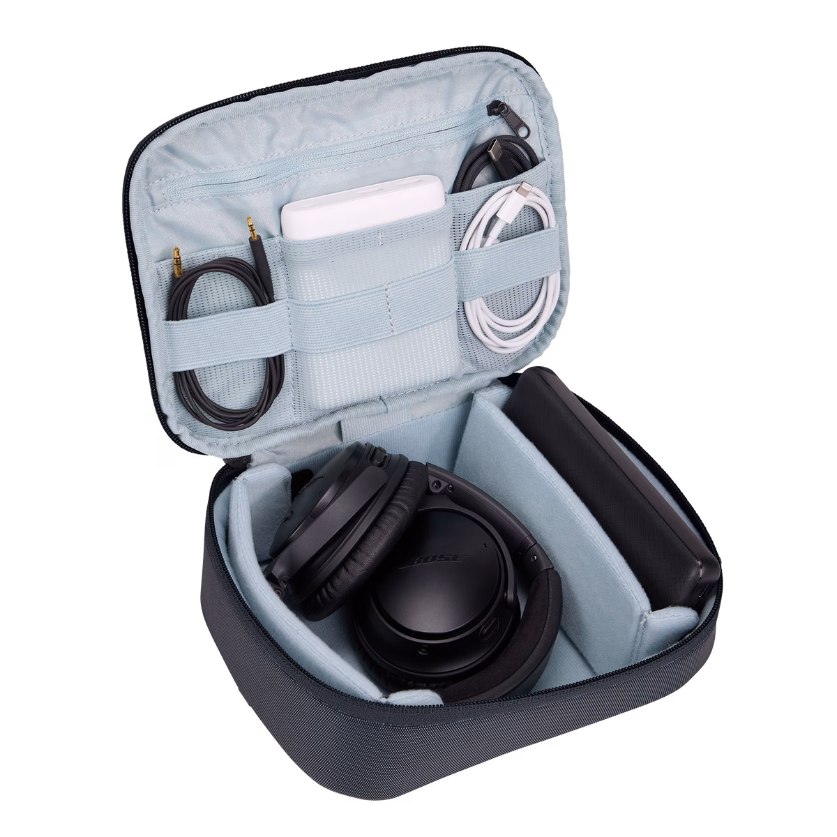 Organiza cables, adaptadores, audífonos y accesorios personales pequeños en distintos bolsillos versátiles y lazos elásticos